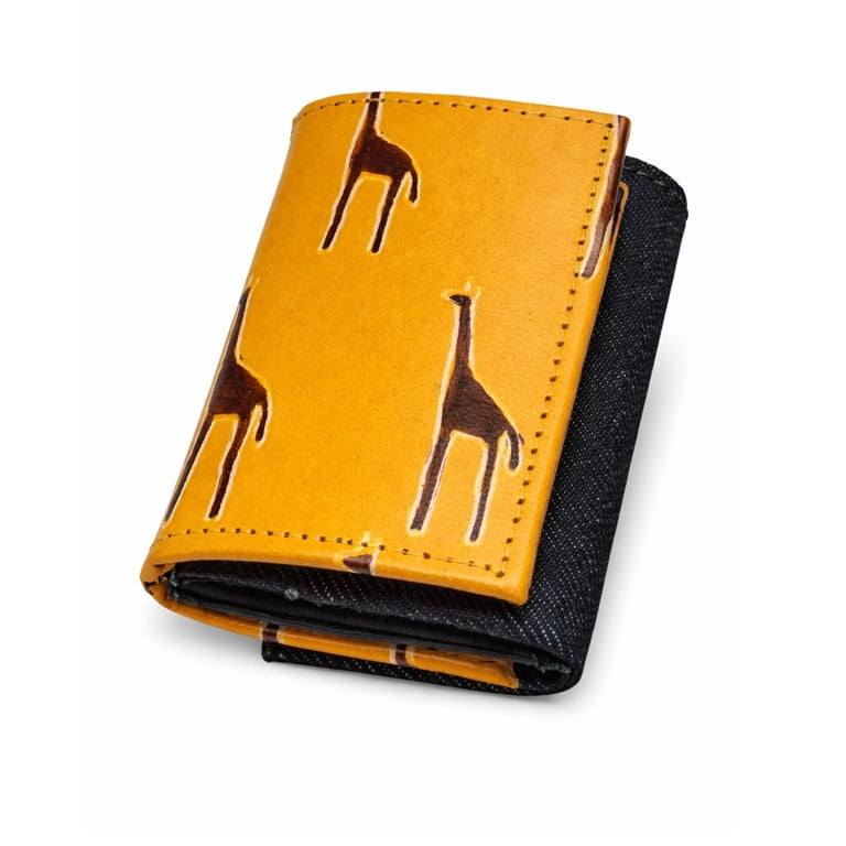 The exterior features elegant hand-painted giraffe motifs inspired by Santiniketan art, showcasing skilled craftsmanship and heritage design. The vibrant mustard yellow leather contrasts beautifully with the black denim interior, creating a unique and eye-catching look.